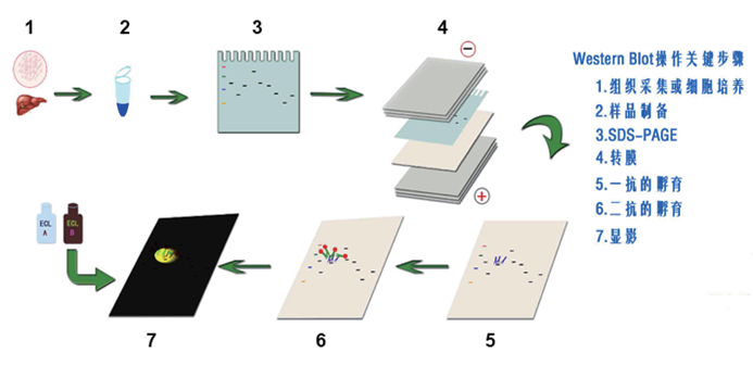 免疫印跡(Immunoblotting)又稱蛋白質印跡(Western Blot,WB),是一種綜合性的免疫學檢測技術。它利用SDS-PAGE技術將生物樣品中的蛋白質分子按分子量的大小在凝膠上分離開,然后用電轉移的方法將蛋白轉移到固相膜上,以固相膜上的蛋白質作為抗原,與對應的抗體起免疫反應,再與酶標記的第二抗體起反應,經過底物顯色或熒光成像等方法以檢測電泳分離的特異性目的基因表達的蛋白質。WB技術現已廣泛應用于蛋白水平的表達研究、抗體活性檢測和疾病早期診斷等多個研究領域。