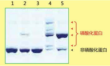 Phos-tag? SDS-PAGE 操作簡單,只需在常規 SDS-PAGE 膠中加入 Phos-tag? Acrylamide 和 Mn2+ 或者 Zn2+ 即可進行實驗。在電泳過程中,磷酸化蛋白的磷酸基團與 Phos-tag? 中的二價金屬離子相結合,降低其遷移速度,從而可區分磷酸化與非磷酸化蛋白。